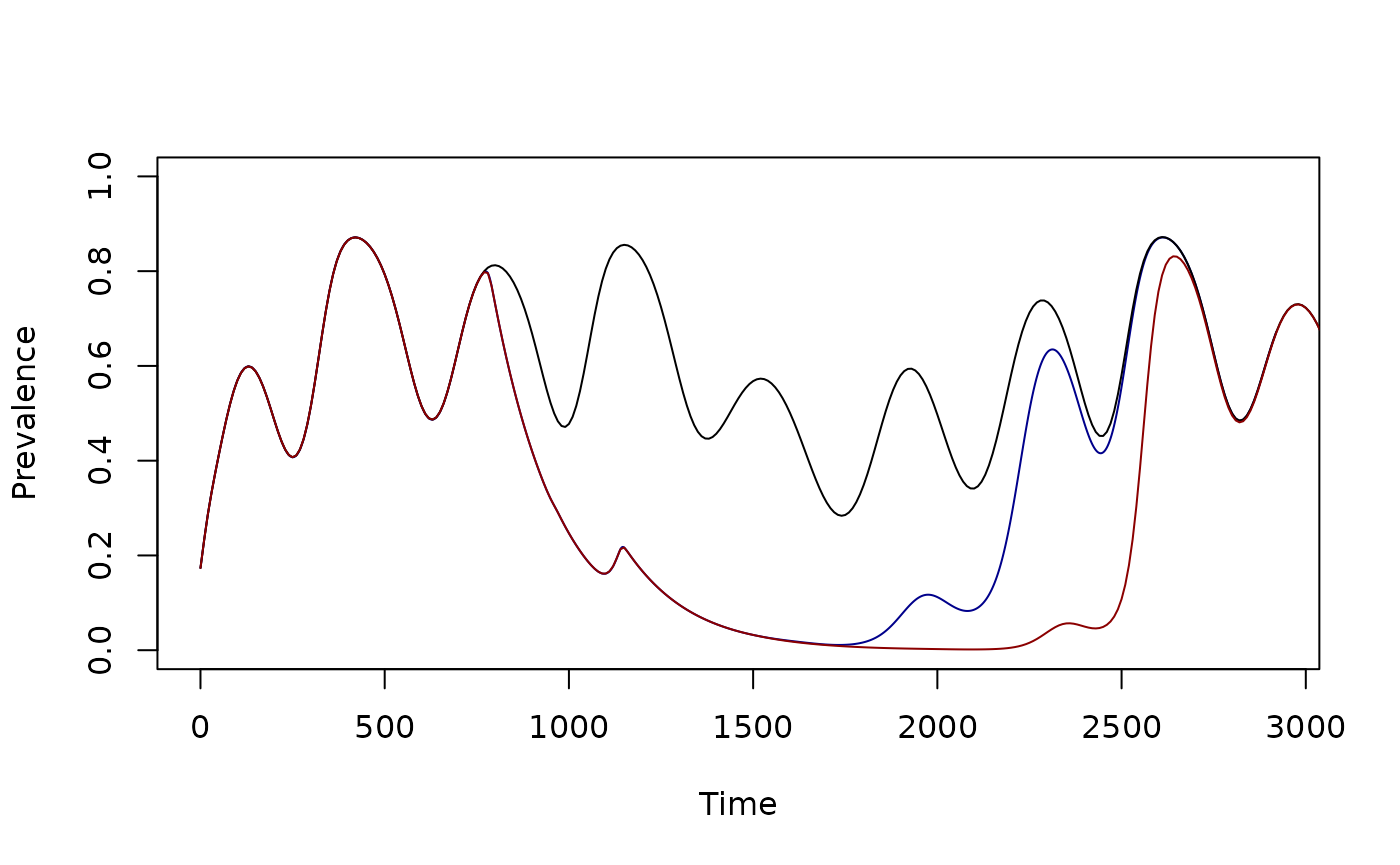 IRS is usually done through a malaria program, so a large number of houses are sprayed in a short period of time. One measure of coverage is the fraction of houses sprayed, \(C\), but since the potency of the insecticide wanes over time, we define coverage as the product of the fraction of houses sprayed and potency, \(P(t)\). It is an operational measure that we can define without thinking much about mosquito behaviors. Coverage is thus independent of mosquito species.